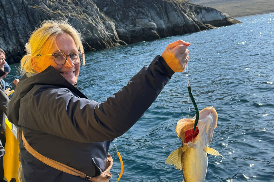 I sommermånederne er farvandene omkring Grønland fyldt med torsk og rødfisk, og selvom vi ikke kan love noget, håber vi på at fange frisk fisk, når vi kaster linerne ud fra båden undervejs. Efter en times tid med sejlads og fiskeri ankommer vi til den forladte bygd Qooqqut, der engang fungerede som fåregård i forrige århundrede. Nu ligger der en restaurant i de gamle træhuse, drevet af den danske kok Mads Bek og hans kone. De har selvfølgelig deres fisk på menuen, men hvis vi har været heldige med fangsten, tilbereder de også gerne vores egen friskfangede fisk i køkkenet. Vi nyder middagen i den hyggelige restaurant, hvor der serveres fisk sammen med grøntsager og krydderurter, som de selv dyrker i køkkenhaven tæt ved. Efter besøget sejler vi tilbage gennem fjorden til Nuuk, hvor resten af eftermiddagen og aftenen er til fri disposition.