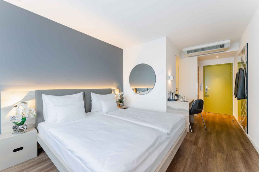 Værelserne på Plaza Inn Wien Gasometer er moderne indrettet. Hvert værelse har seng, aircondition, WLAN, 43-tommer tv, telefon og badeværelse med enten bruser eller badekar. Om morgenen kan gæster nyde morgenbuffet i hotellets morgenmadsrestaurant. Hotelbaren tilbyder lokale vine, kolde drikke, kaffespecialiteter og varme snacks. Baren er åben 24 timer i døgnet og har en indbydende terrasse.